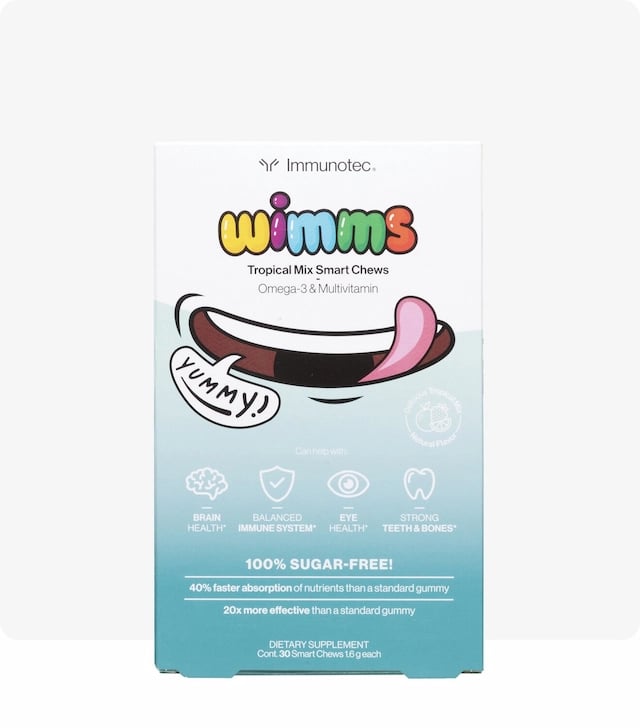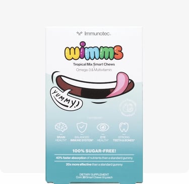 Las gomitas inteligentes Wimms, ofrecen una nutrición de calidad superior con un delicioso sabor tropical, enriquecida por la tecnología de Omega-3 nano-emulsionada para una absorción hasta un 44% más rápida.* Con sólo una gomita sin azúcar al día, los niños obtienen un apoyo efectivo para el cerebro y el sistema inmunológico, ¡sin complicaciones, sin ingredientes artificiales y sin sabor a pescado!